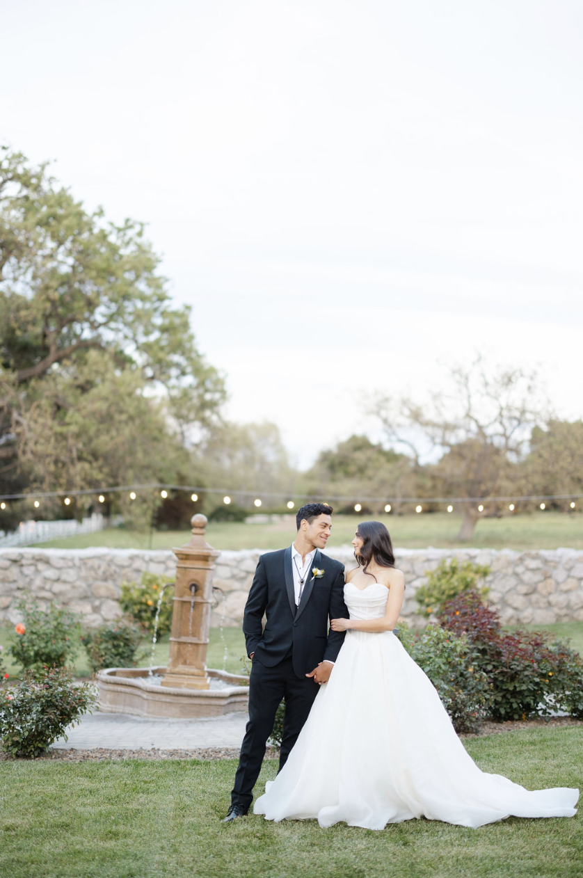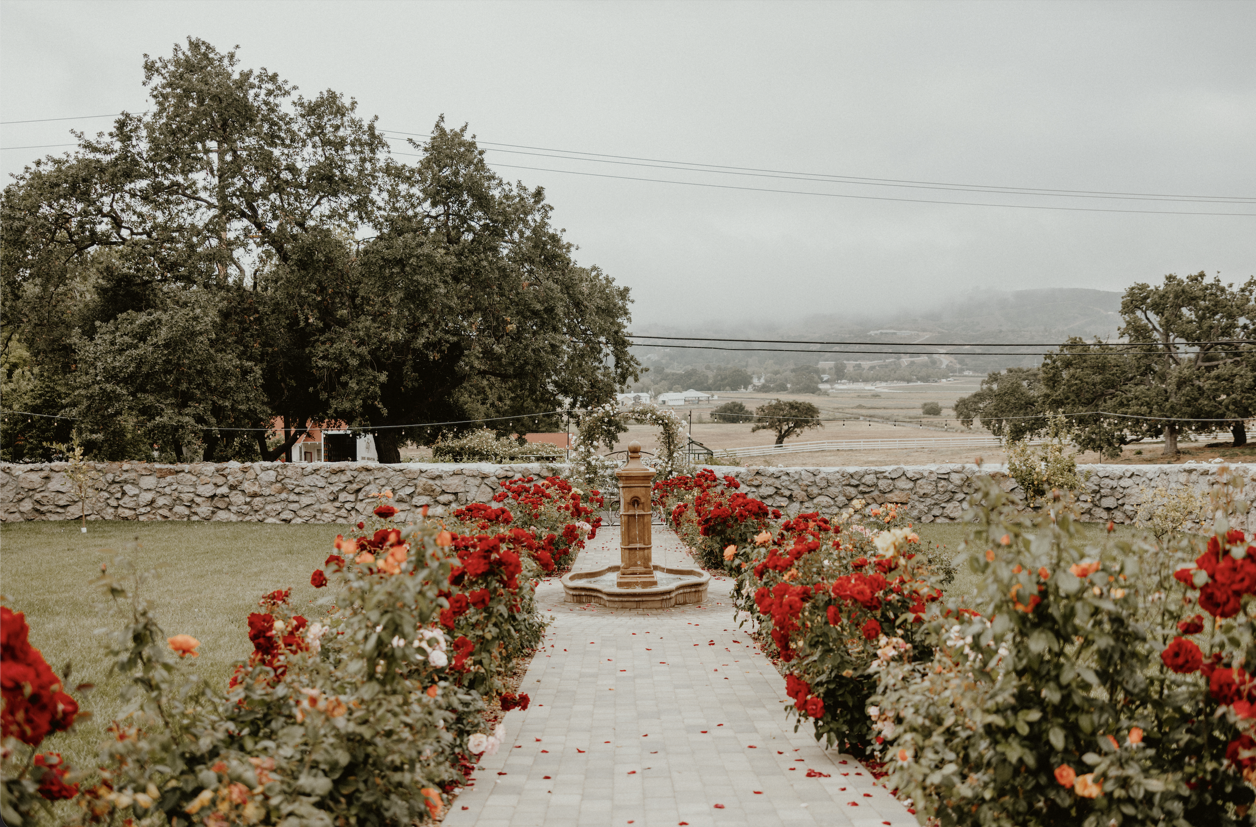 The courtyard garden offers the perfect welcome to your wedding day. As guests arrive via valet from the parking field, they are greeted by a colorful and fragrant rose garden surrounded by hand built rock walls and lush lawn lined with citrus trees. A sparkling fountain sits at the center of the courtyard creating a beautiful gathering place where couples can host welcome drinks and provide a spot for guests to leave gifts. The garden connects to the Milk House, our newly renovated Bridal Suite, where guests may relax on the patio while waiting for loved ones to arrive. When its time for the ceremony, guests follow the winding paved pathway past the ceremony site.