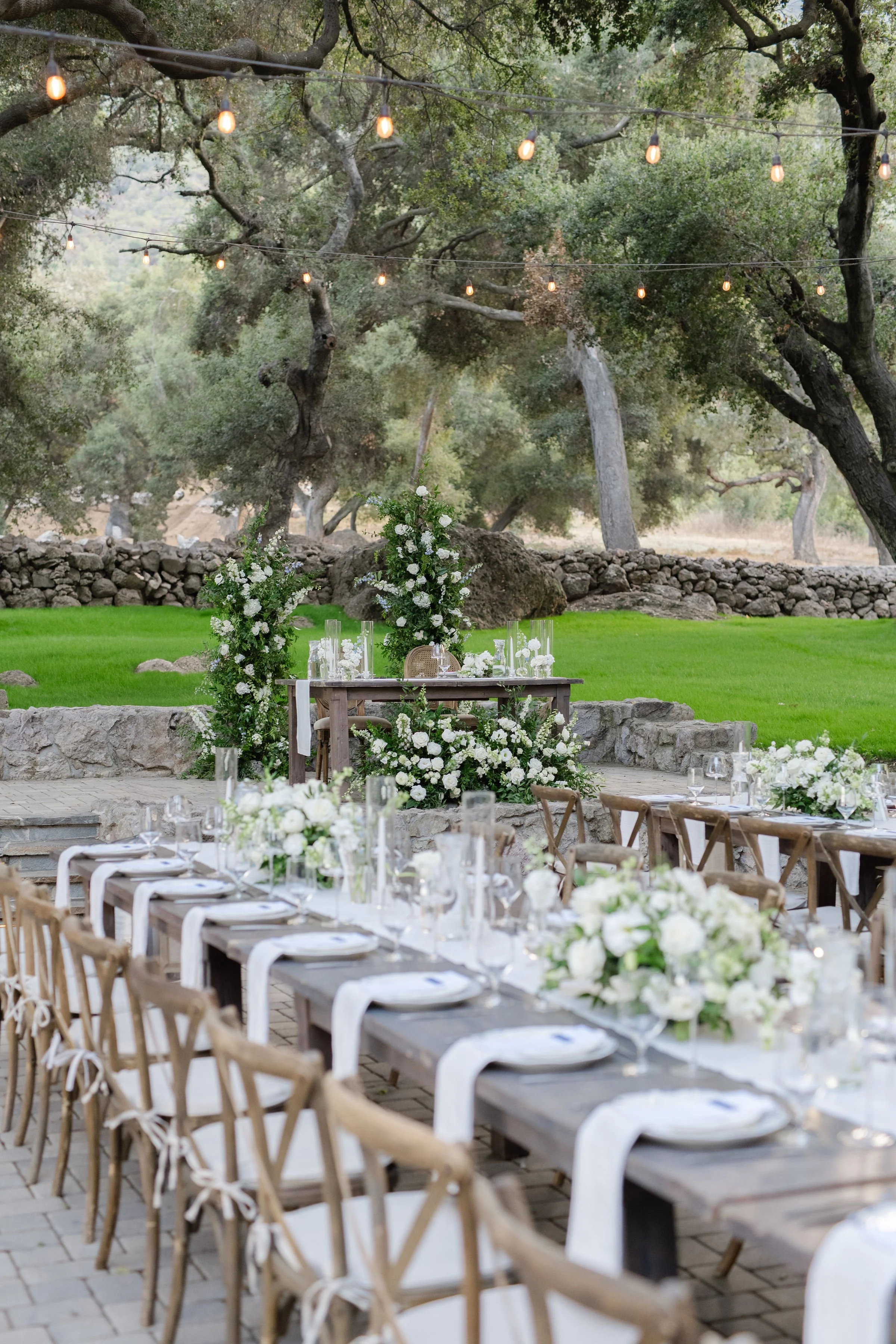 As the sun begins to set, guests gather beneath the canopy of our hundred year old oak trees for an unforgettable reception. Set on our expansive 3,110 square foot paved terrace, this beautiful space is surrounded by hand built rock walls and nestled beside our charming stone fruit orchard. Here, long tables fill with candlelight, glasses are raised for heartfelt toasts, and dinner is shared with loved ones. As the evening unfolds, the music begins, the dance floor fills, and the celebration carries on under the glow of the ambient string lights. It’s a magical setting where special moments are shared and the celebration continues into the night.